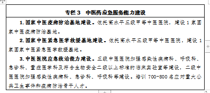 3.提升應(yīng)對(duì)突發(fā)公共衛(wèi)生事件的支撐保障能力。加強(qiáng)中醫(yī)藥應(yīng)急物資、設(shè)施設(shè)備和技術(shù)資源儲(chǔ)備,支持省級(jí)中醫(yī)醫(yī)院建設(shè)中藥材和中成藥戰(zhàn)略儲(chǔ)備基地;支持有條件的中醫(yī)醫(yī)院根據(jù)“平急結(jié)合、中西醫(yī)并重”的原則,建立省級(jí)公共衛(wèi)生基地;加強(qiáng)中醫(yī)疫病防治隊(duì)伍和緊急醫(yī)學(xué)救援隊(duì)伍建設(shè),建立中醫(yī)藥應(yīng)對(duì)重大公共衛(wèi)生事件和疫病防治骨干人才庫(kù)。